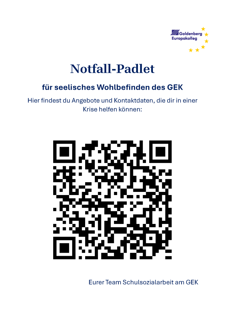 Über unser Notfall-Padlet für seelisches Wohlbefinden findest du auch während der Ferien wichtige Angebote, Anlaufstellen und Kontaktmöglichkeiten, die dir in schwierigen Situationen helfen können.